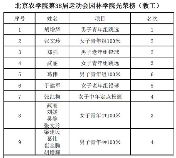 除此以外,教职工运动会也是捷报频传。在男子青年跳远比赛中,胡增辉老师夺取第一名。男子老年铅球郑强老师获得第二名。女子青年跳远武丽老师获得第三名。女子青年教工组张文玲100米第二名。女子中年定点投篮张红梅老师取得第四名。男子青年教工组100米葛伟老师取得第六名。女子老年铅球于建军老师获得第八名。女子青年组4*100米接力以1分10.89秒取得第三名、男子青年组4*100米接力1分02.68秒取得第四名。