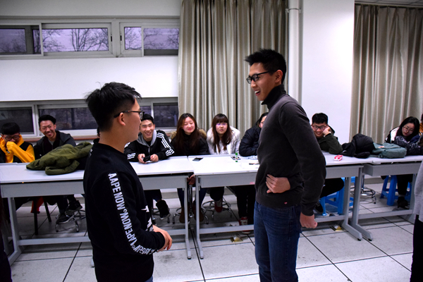 最后的动作接龙游戏;小组六个人排成一列,由最后一人做一个动作让前面的人做出并增加新的动作。不断累积、循环,直至无法做出动作的人被淘汰,每组选出最强者参与最终的决赛。同学们都拿出了绝活,给对手留下了突破生理极限的挑战。最终林学2班的杨雯玉同学获得了最终的胜利,并为同组的同学赢得了奖品。