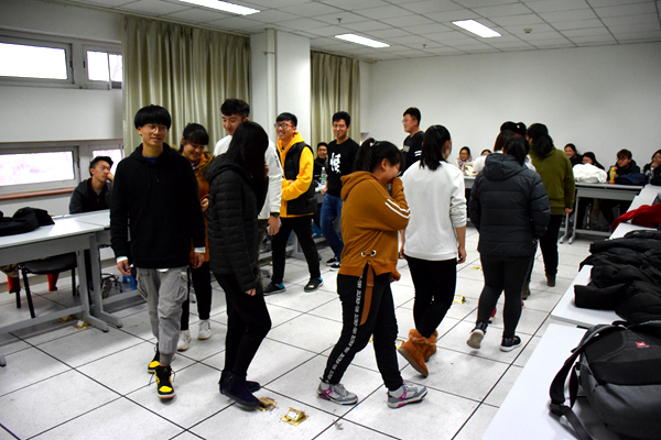 伴随着音乐响起,团团抱游戏开始。每次参与活动者为10人,在乐曲中听主持人的口令“三人抱成团”,参与者在最短的时间内找到两人抱好,剩下的人被淘汰。随着游戏一次次的进行,同学们越来越快的抱在了一起,并在脸上洋溢起愉悦的笑容。