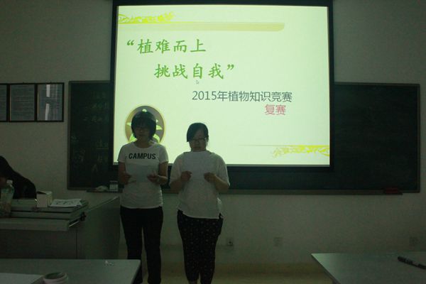 六点十分,比赛正式开始,首先主持人对比赛流程进行了详细介绍。此次比赛共分为三个环节:第一环节是看图回答,屏幕显示植物图片,选手需要准确回答出该植物的名称以及某科某属,这就要求选手们对图片上的植物有非常熟悉认知能力;第二环节是你画我猜,一名选手负责将题板上的植物画出来,另外一名同学来识别植物种类,这一环节需要参赛选手有高度的默契和配合能力;第三环节是紧张激烈的计时回答,两位队员一问一答,争分夺秒。九组选手在这三个环节中进行了紧张激烈的角逐,每组都不甘示弱。最后许蓉、李建一以第一名胜出,张正兴、张琪琪紧随其后,获得第二名。