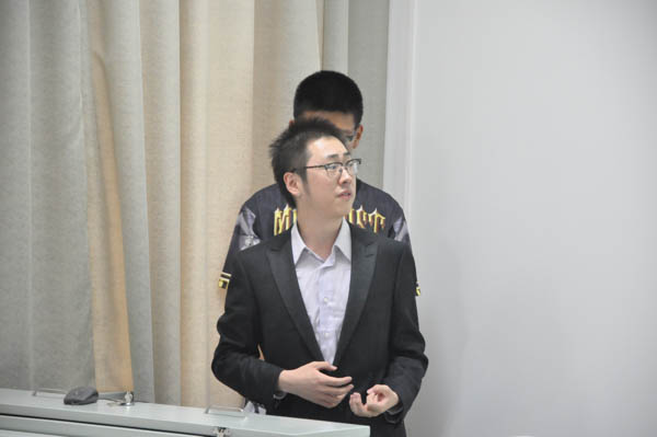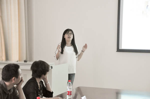 第二组由安琦同学上台答辩。他的设计主题为四个词:简约、细胞、植物、脉络。他分析园林楼大厅现状为缺乏空间导视系统和一层大厅空间浪费。其设计推导分为园林个性、园林与动科的共性和植物与动物的关系三个方面。方案一是把大厅分为三个展示空间——交通空间、展览空间、休闲空间;方案二则是把大厅分为外展区与内展区,外展区设立展板而内展区设立展览平台以具有层次感。他向大家展示了几种大样平面图设计,包括指向箭头等一些细节问题,不仅设想、也展示了他具有艺术特色的设计方案。老师们肯定了他的设计与努力,也指出了他所设计的标识系统有趣但联系性不强等不足。贾海洋老师还从文化角度设计方面提出自己的看法,认为从古至今传统的观点都在于“生”,而安琦一组的“细胞分裂”概念则略显跑题。在我们的发展过程中,“生”比“分”更为重要。