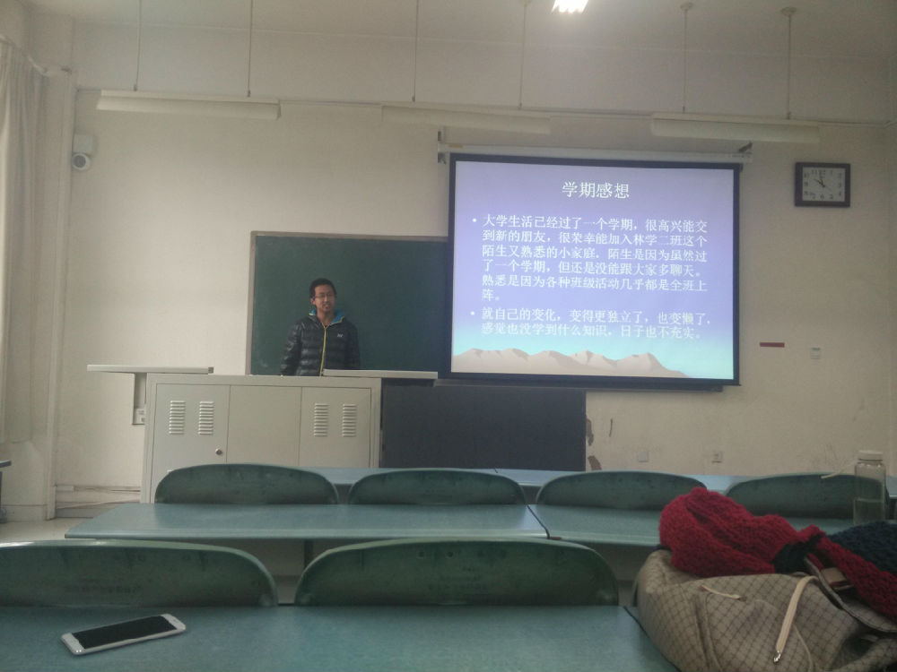 2015年1月15日上午yl9193永利集团14级林学二班在教B113教室召开了期末述学班会。班会上,每位同学以PPT的形式总结了自己从开学到期末4个多月间的经历与收获。