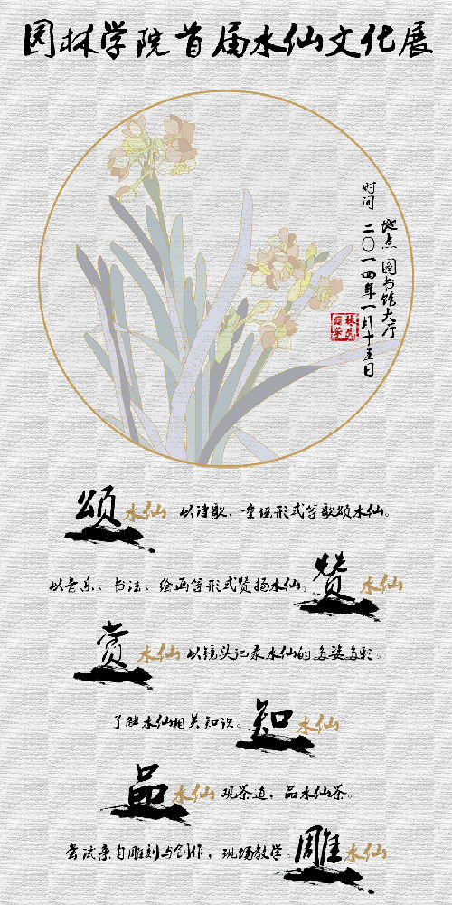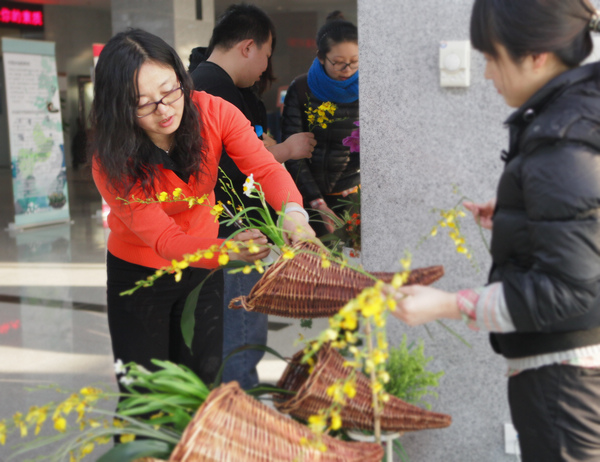 此次水仙文化展的主题是:“颂水仙、赞水仙、赏水仙、知水仙、品水仙、雕水仙”。在本次水仙文化展上,参观者可以一睹水仙花千姿百态的文化艺术魅力。“春江水暖”、“母子情”等员工和老师的72件水仙花插花,雕刻及组合造型惟妙惟肖,千姿百态,清雅幽香,不仅给参观者以视觉和嗅觉的享受,也给人们带来春的气息和美好的希望。