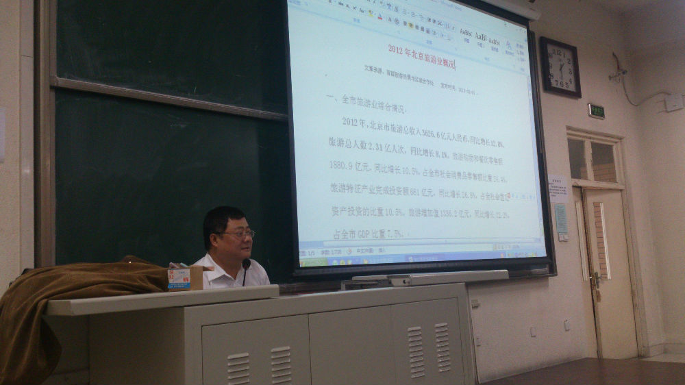 刘洪利教授以幽默的语言、翔实的数据和生动的案例向老师和同学们解释了目前北京旅游业的发展现状以及北京旅游人才的开发情况。他首先从北京市旅游发展的统计数字出发,向同学们表达了“北京旅游业发展潜力巨大”的观点。然后从北京星级酒店人力资源状况的角度,提出目前北京旅游人力资源结构不尽合理,高学历高层次人才比例很低,还应大力开发。在讲座的最后,刘教授以一位资深导游的身份,对旅游管理专业的员工提出了“知识、语言、技能”的专业发展要求,鼓励大家毕业后积极参与北京旅游业。