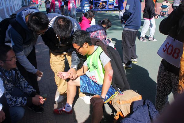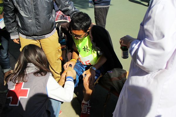 没有赛场上的喧闹,没有鲜花与掌声,他们是站在所有运动员身后默默工作着的一群人。两张木制长桌是他们的大本营,运动场内外皆是他们的战场。他们,忙碌于赛场的各个角落,始终坚守自己阵地,随时为运动健儿和同学们提供无微不至的服务——更新赛况展板方便同学们了解赛事;清点参赛运动员人数,核对参赛号码以确保运动员及时到场检录;照顾受伤运动员,为他们提供休息的场所;为运动员寻找合适的跑鞋……