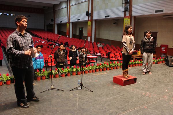 最后,负责人又把所有同学带到教室观看彩排的录像,让每一位同学都能看到自己在台上的表现,以便更好地改进。一次次暂停,一遍遍播放。大到站姿小到摇摆幅度,每个细节问题都被负责人指出并加以纠正,一点点小的瑕疵都不会放过。同学们也一边目不转睛的看着录像一边思忖着怎么改进来让自己在决赛的舞台上有着更好的发挥。