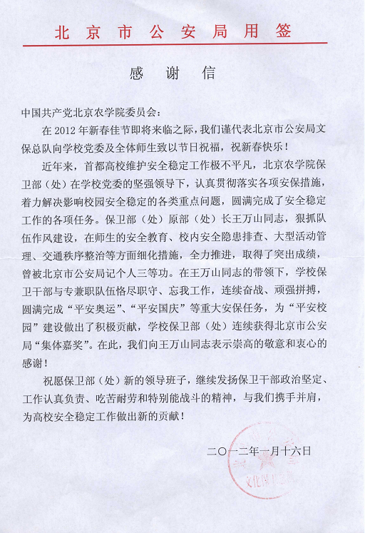 北京市公安局给公司发来感谢信