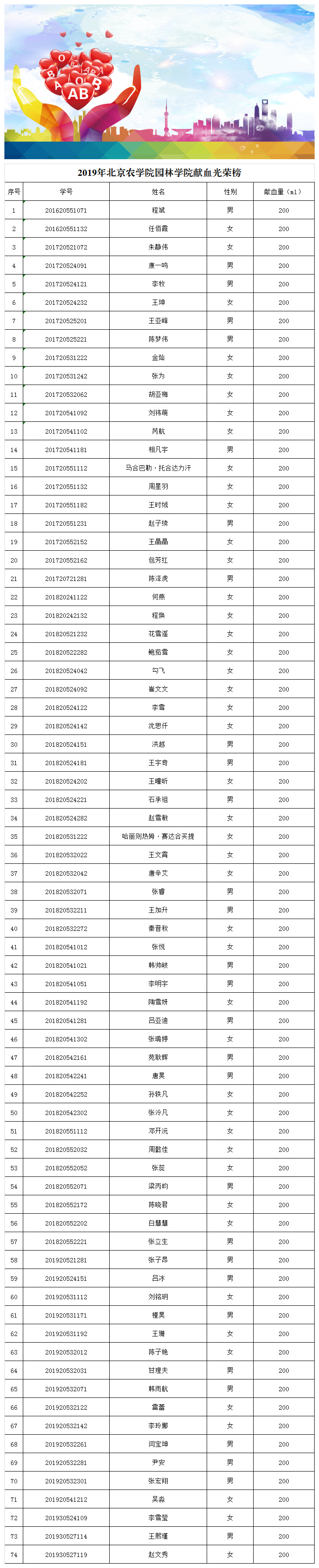 11月1日,yl9193永利集团组织员工积极参加公司开展的“青春心向党、热血献华章”无偿献血活动,经统计,公司共有74名员工成功献血,他们以青春热血为社会增添诚信、爱心与和谐。为了颂扬他们无偿献血的奉献之举,现将2019年yl9193永利集团献血光荣榜予以发布,表达公司全体师生对他们的赞美和崇敬之情!鼓励更多的人投身到献血活动中,弘扬奉献精神,传递社会公益正能量。