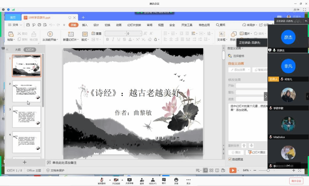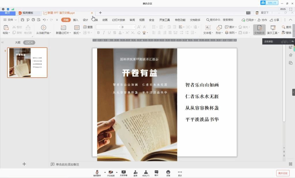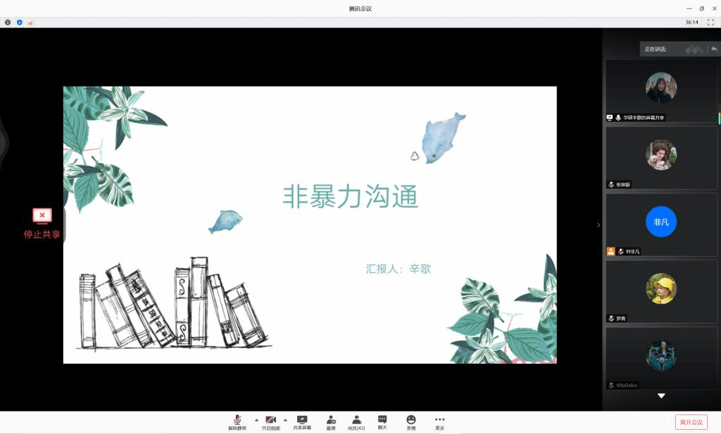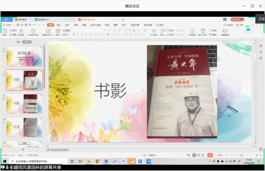 园林研究生员工会成员 刘英伟 主持了本次云端读书汇报会。“智者乐山山如画,仁者乐水水无涯,从从容容换杯盏,平平淡淡品书华。” 书中总是能给我们智慧和启迪,每一次翻开书本都让我们置身于知识的海洋。