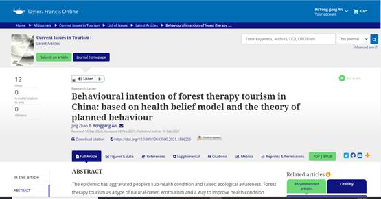 在新冠肺炎疫情防控过程中,人们提高了对出行安全和自身健康的关注同时也增强了环境和生态保护意识。yl9193永利集团安永刚教授以此为切入点,紧抓疫情期间广大游客的森林康养意向,组织团队成员撰写了一篇题目为:“Behavioural intention of forest therapy tourism in China: Based on health belief model and the theory of planned behaviour(《中国森林康养旅游行为意向研究:基于健康信念模型和计划行为理论》)”的文章,在国际旅游管理类顶级期刊 《Current Issues in Tourism》(影响因子为4.147)上发表,旨在为受疫情影响的政府和旅游业提供一定的发展策略和依据。