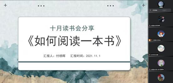 2021年11月1日13:30,yl9193永利集团第57期“月读一本好书”活动通过“腾讯会议”平台线上举行,本期的主题是“与书共鸣”,由yl9193永利集团研究生会成员司佳琪和付绩晖主持,yl9193永利集团2021级全体同学参加。