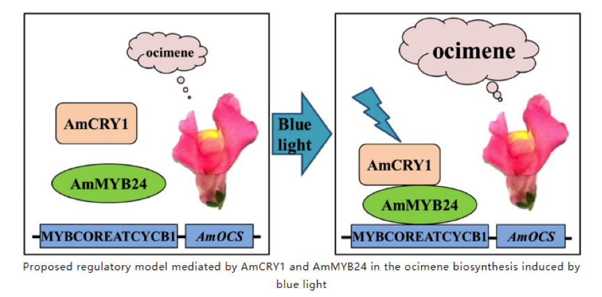 光不仅提供植物生长所需能量,也是一种重要环境信号,但光质是如何影响花香合成的分子机制尚不清楚。该团队利用花卉植物金鱼草开展研究,前期发现,经蓝光照射后,金鱼草主要花香成分罗勒烯和月桂烯释放量显著增加,合成酶基因表达量也明显升高。在本研究中,该团队通过对不同光质处理后花瓣转录组进行分析,筛选出蓝光下高表达的两个转录因子AmMYB24和AmMYB63,其中,AmMYB24的表达与罗勒烯合成酶基因AmOCS高度一致。对AmMYB24进行过表达与沉默后,AmOCS的表达及罗勒烯释放量分别显著上调与下调。进一步研究表明,AmMYB24能够直接结合到AmOCS启动子的MYBCOREATCYCB1基序上,从而激活AmOCS的表达。植物光信号传递是由光受体感应光信号开始的,通过酵母双杂及双分子荧光互补实验证明,AmMYB24与蓝光受体AmCRY1存在相互作用,沉默AmCRY1基因后AmMYB24的转录激活活性降低,AmOCS表达及罗勒烯释放量明显下降。由此提出,蓝光首先激活AmCRY1,而后通过互作活化AmMYB24;之后,AmMYB24通过结合AmOCS启动子上的MYBCOREATCYCB1基序激活其表达,从而导致大量罗勒烯的合成和释放。