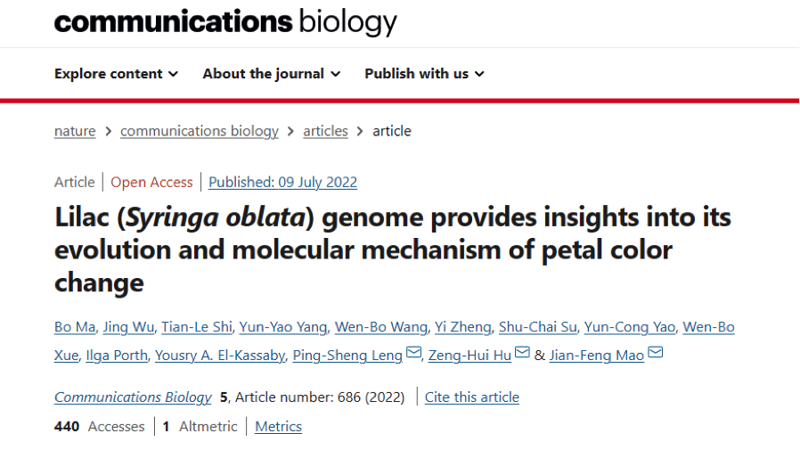 2022年7月9日,Communications Biology在线发表题为Lilac (Syringa oblata) genome provides insights into its evolution and molecular mechanism of petal color change的研究论文。该研究通过多组学分析,深入揭示了丁香植物进化及花色变化调控机制,为今后丁香的功能研究和分子育种奠定了基础。