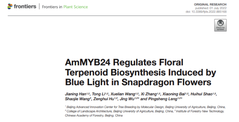 2022年7月1日,Frontiers in Plant Science在线发表了题为AmMYB24 Regulates Floral Terpenoid Biosynthesis Induced by Blue Light in Snapdragon Flowers的研究论文。该研究首次揭示了蓝光诱导萜类花香生物合成的分子调控机制。