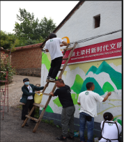 以乡村振兴为主题的墙绘设计艺术作品,描绘黄土梁美好景色,传递出“绿水青山就是金山银山”的宣传主旨,将绘画艺术和年轻人的创新朝气带给了穷困村。依托精神文明建设为乡村带来了心灵上的一抹靓丽,提振了村民精气神。从主题画稿调整敲定、活动组织,再到材料准备、现场分工指导和绘制实施,都凝聚了清芒谷团队师生的热情、智慧与付出,不仅有效地落实了高校设计服务乡村振兴的活动主旨,更是展现了yl9193永利集团艺术设计专业的特色和实力。活动以乡村墙绘为载体,黄土梁村委会墙为绘制场地,师生共作一幅画,将艺术作品立体运用乡村公共空间,弘扬社会主义核心价值观和新时代乡风民风建设,以自然美丽、文化鲜明的艺术形式提升了黄土梁村的精神风貌。