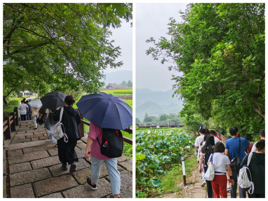 自由活动时间依然能够体现公司的“OBE”(成果导向教育)教学理念。同学们以小组形式展开实地作业:有的测绘记录村中“四旁绿地”与乡村公园,有的访谈村民与创业者,有的记录植物搭配与生态技术细节。尽管细雨不断,大家的调研热情却持续高涨。“每一处景观背后都是发展理念的支撑,我们要读懂的不仅是空间,更是人与土地关系的重构。”员工马梁瑞分享道。