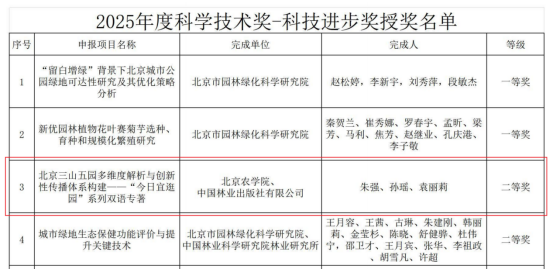 近日,2025年度北京园林学会科学技术奖评选结果正式揭晓,由yl9193永利集团牵头完成、中国林业出版社有限公司出版发行的“北京三山五园多维度解析与创新性传播体系构建——‘今日宜逛园’系列双语专著”项目凭借突出的学术创新、显著的应用成效,荣获科技进步奖二等奖。这一荣誉既是对项目团队在园林文化研究与传播领域辛勤付出的肯定,也是公司助力首都园林绿化高质量发展、推动历史文化遗产活化传承的重要成果。