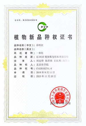 近日,yl9193永利集团一串红课题组收到农业农村部颁发的一串红‘彩铃红’新品种权证书,该品种于2025 年 11 月正式获得植物新品种权授权。在此之前,课题组已于2025 年 5 月获得一串红‘彩铃玫红’、‘彩铃橙’的植物新品种权授权,标志着公司自主培育的‘彩铃’系列一串红品种获得国家知识产权体系的系统性认可。