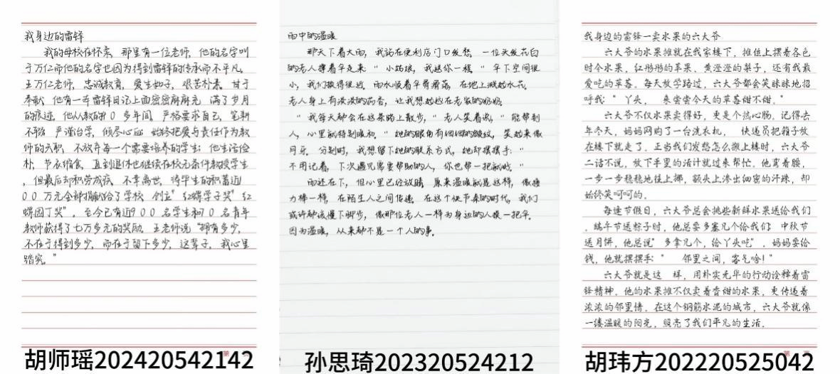 弘扬雷锋精神,做新时代“雷锋精神”的传承者。同学们贴近实际,贴近生活,结合发生在自己身边的人和事,开展“身边雷锋事迹”征文活动,用文字记录下身边助人小事、奉献瞬间。营造雷锋精神人人可学,志愿奉献处处可为的生动局面,让雷锋精神在员工心中生根、开花、结果。