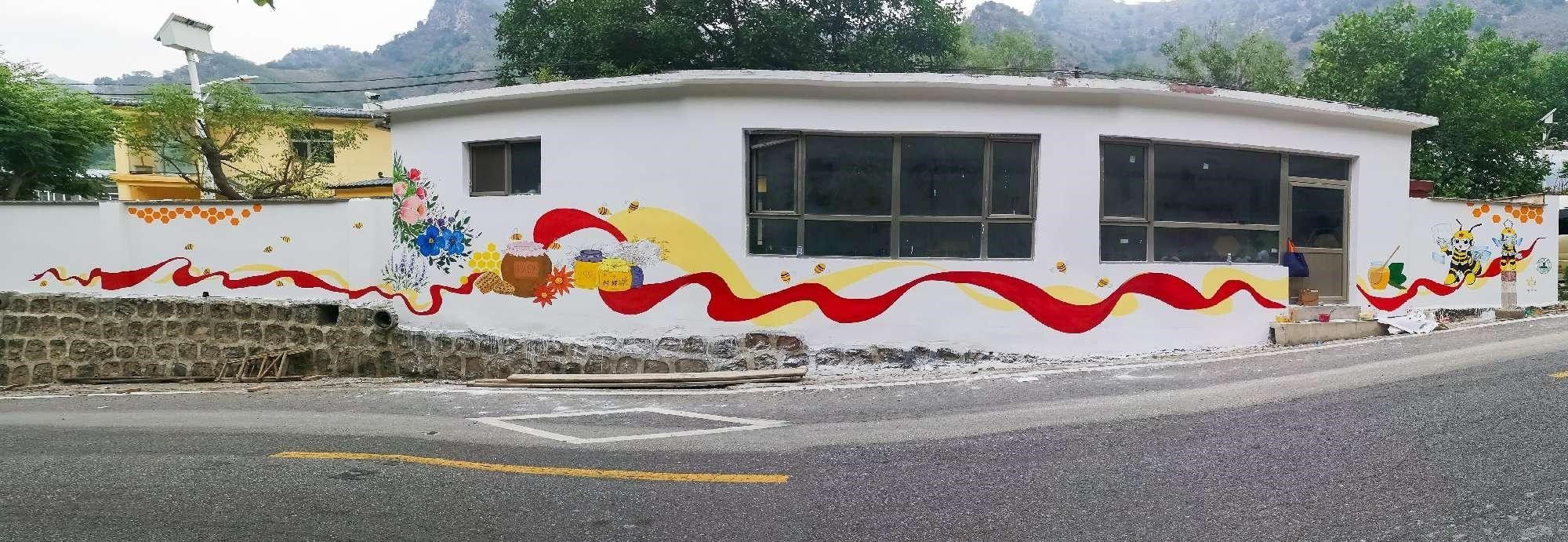 设计实践团队依据村庄痛点,将文创设计根植与乡村传统文化,高质量实现文化更新,改善乡村空间文化生产,推动新时代乡村建设的清芒谷模式。墙绘设计主题以蒲洼乡蜂产业和乡村红色基因为主要元素,通过对比和写意的设计表现手法,体现出传统文化的传承;运用大胆的线条和写意的手法,营造出可爱、活泼的蜜蜂IP形象;利用花朵和两根互相缠绕的红丝带来增加墙绘的立体感、层次感,飘扬的红丝带象征着红色山乡党建引领乡村振兴。