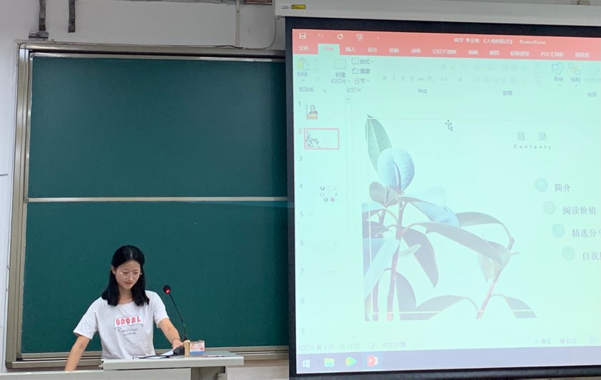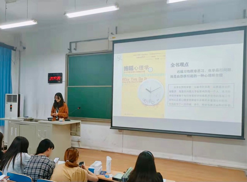 在阅读分享环节的最后,是来自风景园林的赵璧同学为我们带来的《拖延心理学》。她从自己的生活经验出发,引出书中关于拖延心理的分析。这本书中关于拖延心里的分析全面而深刻,它不但会教你直面内心的恐惧,还能给你一些行之有效的建议。在座的同学们认真学习,受益良多。