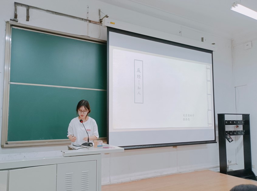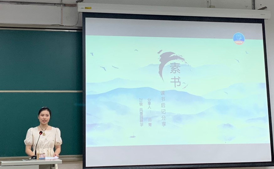 第一位进行分享的是风景园林学的田菁同学,她为我们带来的是秦末时期黄石公所作的《素书》。《素书》提出“道、德、仁、义、礼,五者一体”,以道理为宗旨,同时以此作为立身治国的根本、揆度宇宙万物自然运化的理数,以此认识事物本原。田菁同学以张良提鞋的故事做引,为大家分享了《素书》内所讲述的,大至治国安邦、小至为人处事的智慧道理。大家认真聆听田菁同学的分享,受益匪浅。