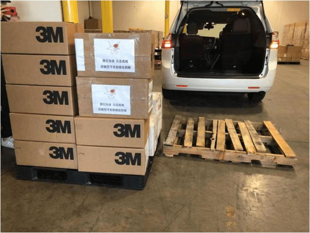最终我们的物资由盛康达货运(深圳)、江苏泓程国际物流、美国 CN-USA EXPRESS 三家国际物流公司成立的JCS团队负责的公益国际物流方案来解决,考虑到众多捐赠渠道有限,JCS临时开辟一条新的捐赠渠道,全力帮助美国海外华人团体接收货物运输回湖北。我们也拥有LA神龙公司作为合作伙伴负责从洛杉矶统一送回长沙,国内由人福医药接手,送达各指定医院。人福医药是湖北省政府认证的四大运输公司,在目前复杂的拦截路况中起到了决定性作用。根据捐赠者的意愿我们将物资送达指定医院,捐赠者不指定医院的,我们按照目前对接的医院以及确认核实过的需求名单,按比例分配,尽量照顾最急缺的医院。