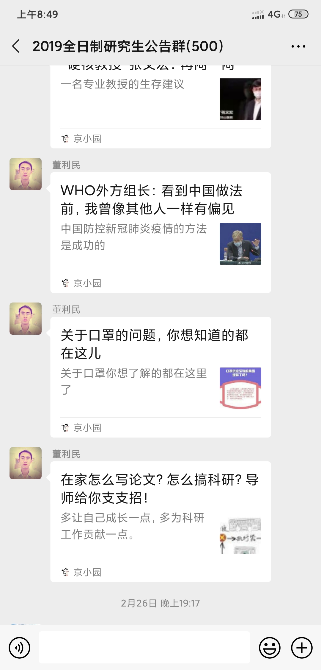 1月23日,武汉封城消息刚传出,公司即在班级群里发通知,开始统计大家的健康状况。此刻在家的我,有种感动,即使是放假公司还是关心着我们。到晚上时,老师发《新型冠状病毒肺炎预防手册》到群里,公司研工部及时在微信上推送“怎样预防新型冠状病毒?我们应该知道!”,给大家提供科学的预防建议。权威可信的信息不断的发布到班级群中,使我们在这未知的疫情面前不迷茫,不会被各种谣言假信息欺骗,让大家了解真实的情况,在疫情面前,有了坚定豁达乐观的心态,认真做好个人防护,配合村庄、政府做好防疫工作,相信党和国家、政府会有效应对此次疫情,我们一定会迎来一个明媚的春天。