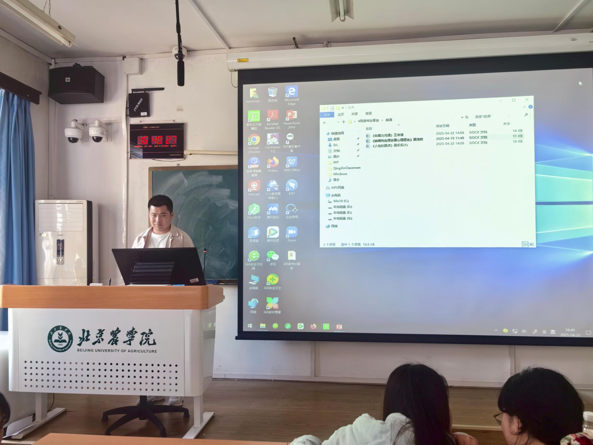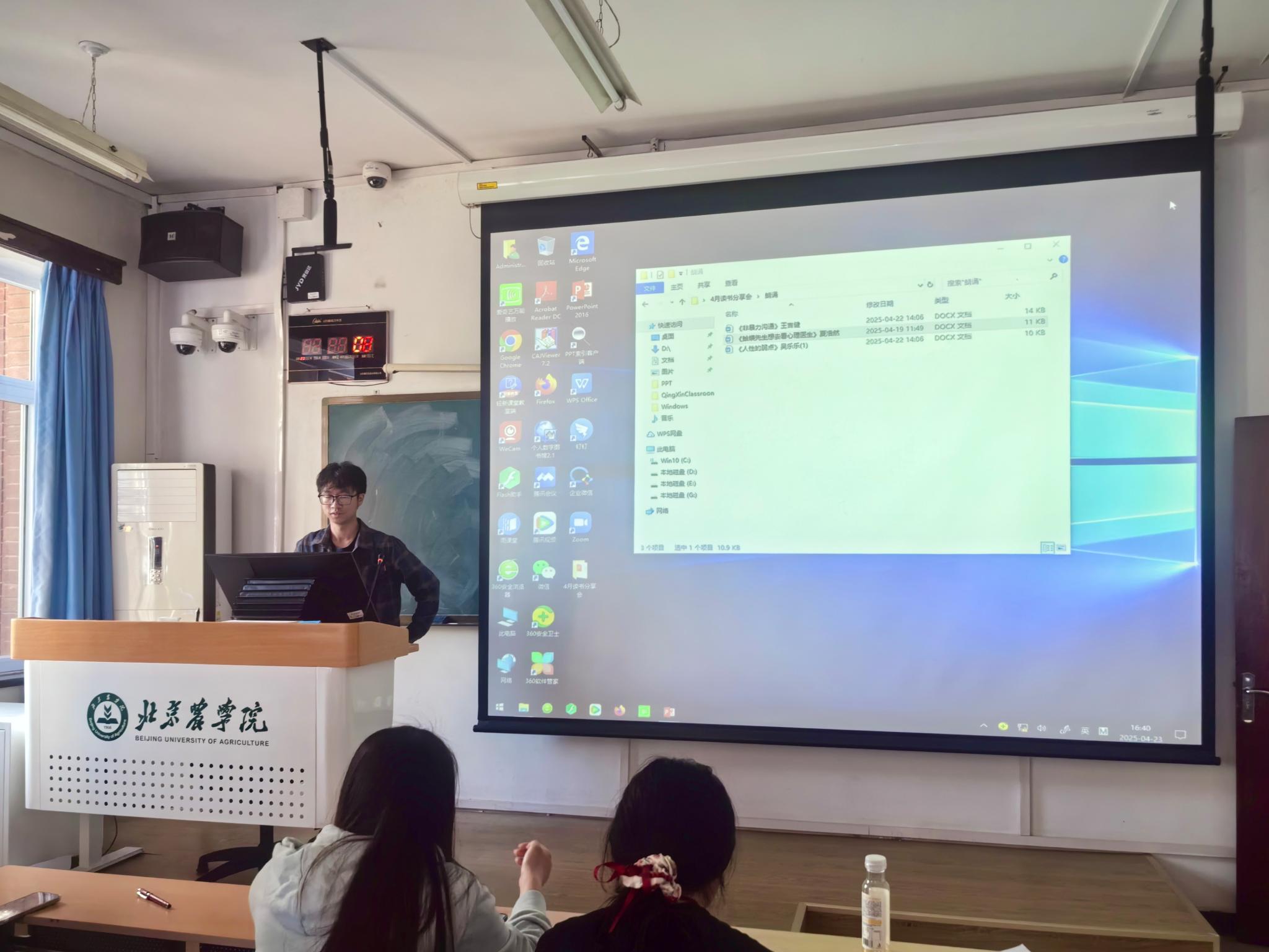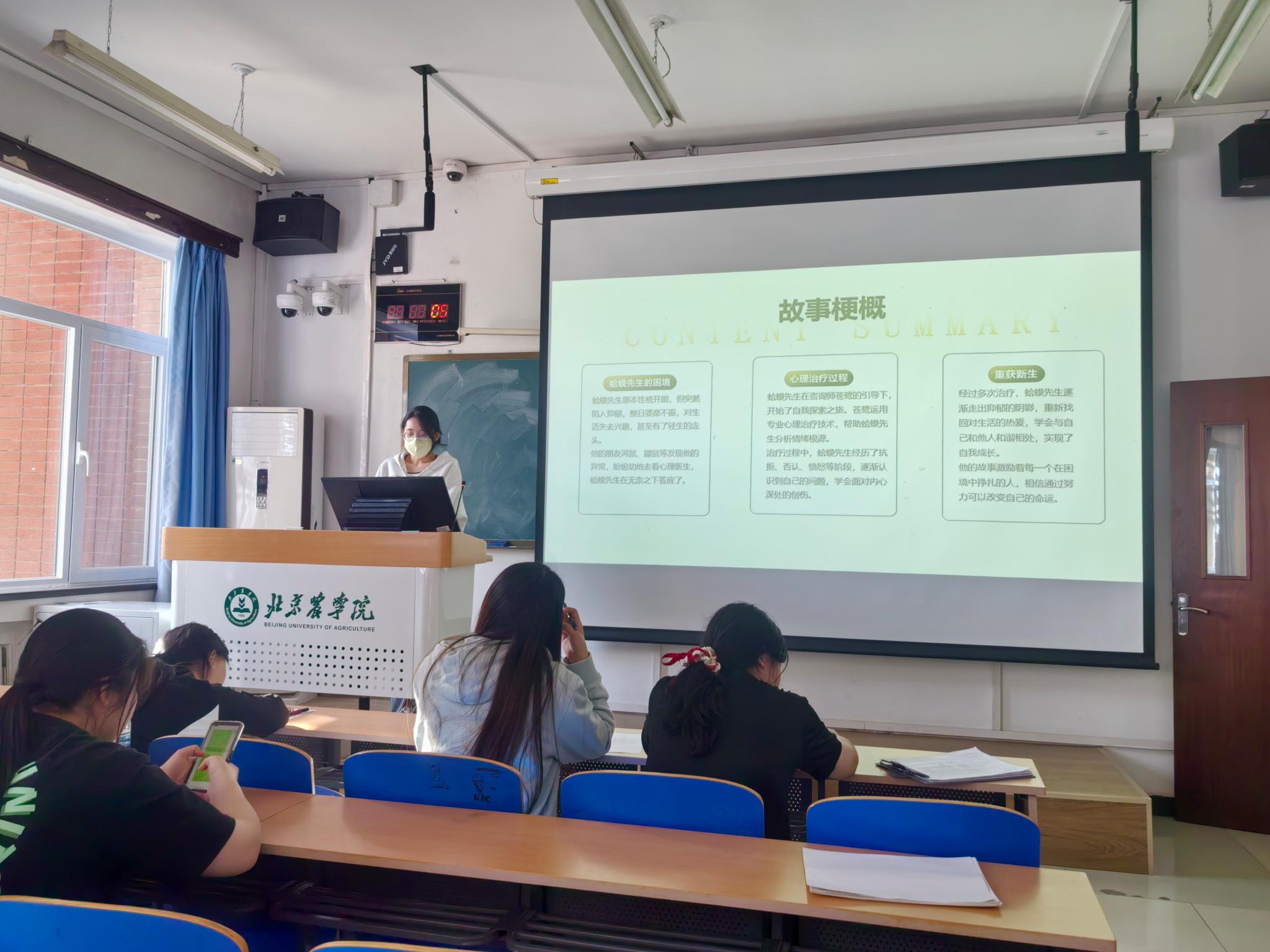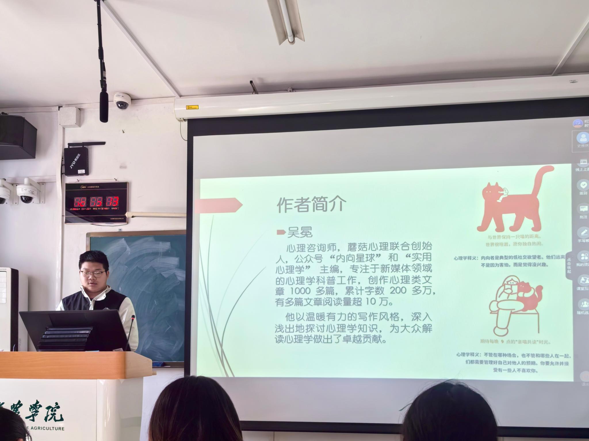 顿煜婧同学通过对《蛤蟆先生去看心理医生》作者、写作背景以及对蛤蟆先生在心理咨询过程中的心路历程的讲解,让我们随着蛤蟆先生从自卑、迷茫到逐渐找回自信与勇气。顿煜婧同学的分享让在场的每一位同学都深受触动。
