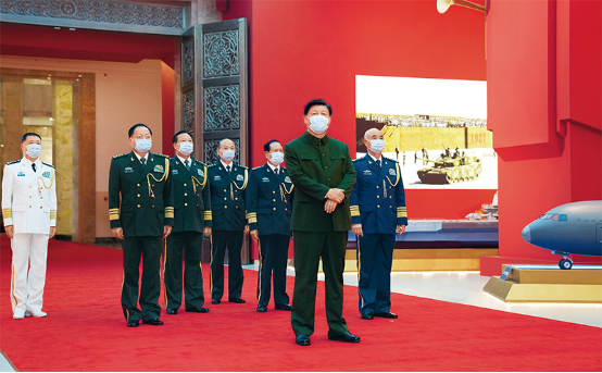 2022年7月27日,在庆祝中国人民解放军建军95周年之际,中共中央总书记、国家主席、中央军委主席习近平前往中国人民革命军事博物馆,参观“领航强军向复兴——新时代国防和军队建设成就展”。新华社记者 李刚/摄